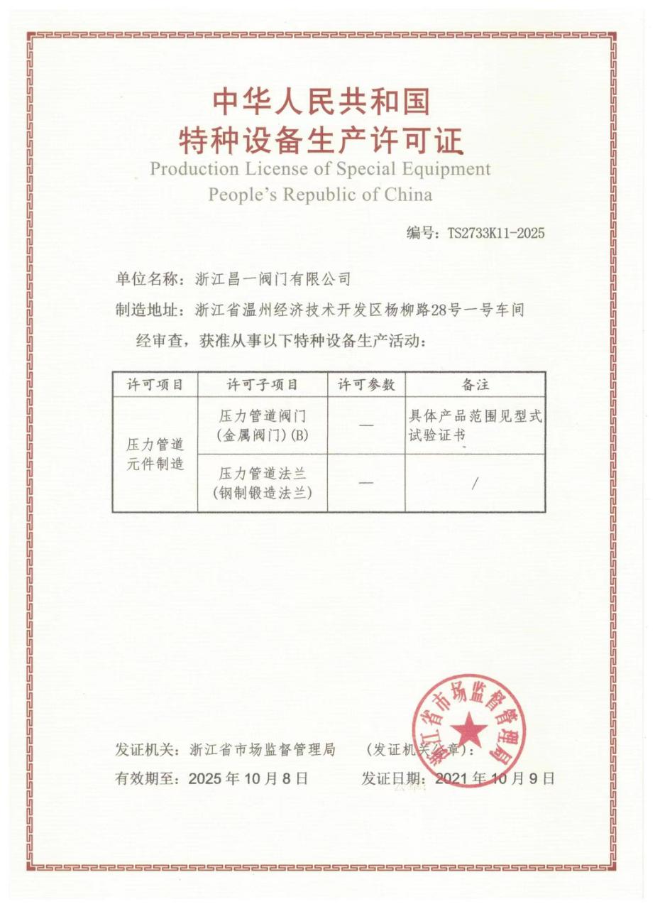 本公司生產加工場所、生產設備、設施、檢測儀器、管理人員、技術人員等在同行業中處于先進水平,符合相關國家法律、法規要求,獲得省級市場監管局頒布的特種設備生產許可證。