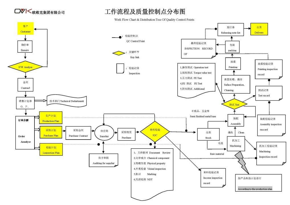 公司按照閥門標準設立有質量網絡檢測節點,實現檢測項目全覆蓋,生產過程層層把關。采取定崗定責、過程檢查、質量考核、責任追究、質量追溯、數據統計分析等一系列行之有效的方法,做到關鍵工序重點控制、普通工序規范操作,通過對生產過程的全面控制和對關鍵節點的有效監督,提高了工作質量,保證了產品質量。