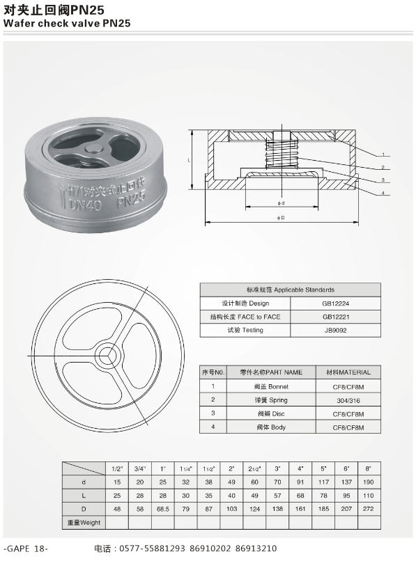 其中不銹鋼對夾式止回閥就屬于這種類型的閥門,它包括旋啟式止回閥和升降式止回閥。旋啟式止回閥有一介鉸鏈機(jī)構(gòu),還有一個(gè)像門一樣的閥瓣自由地靠在傾斜的閥座表面上。為了確保閥瓣每次都能到達(dá)閥座面的合適位置,閥瓣設(shè)計(jì)在鉸鏈機(jī)構(gòu),以便閥瓣具有足夠有旋啟空間,并使閥瓣真正的、全面的與閥座接觸。閥瓣可以全部用金屬制成,也可以在金屬上鑲嵌皮革、橡膠、或者采用合成覆蓋面,這取決于使用性能的要求。旋啟式止回閥在完全打開的狀況下,流體壓力幾乎不受阻礙,因此通過閥門的壓力降相對較小。升降式止回閥的閥瓣座落位于閥體上閥座密封面上。此閥門除了閥瓣可以自由地升降之外,其余部分如同截止閥一樣,流體壓力使閥瓣從閥座密封面上抬起,介質(zhì)回流導(dǎo)致閥瓣回落到閥座上,并切斷流動。根據(jù)使用條件,閥瓣可以是全金屬結(jié)構(gòu),也可以是在閥瓣架上鑲嵌橡膠墊或橡膠環(huán)的形式。像截止閥一樣,流體通過升降式止回閥的通道也是狹窄的,因此通過升降式止回閥的壓力降比旋啟式止回閥大些,而且旋啟式止回閥的流量受到的限制很少。